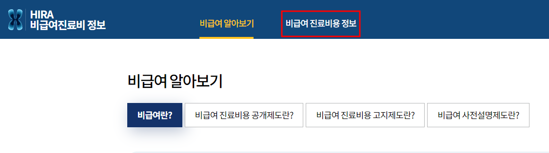 비급여 진료비 정보 알아보기 - '비급여 진료비용 정보'를 클릭합니다.