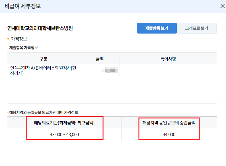 예시로 세브란스병원을 입력해 보았습니다. 비급여 진료비용을 확인할 수 있습니다.